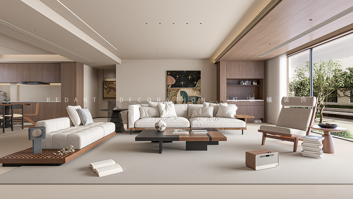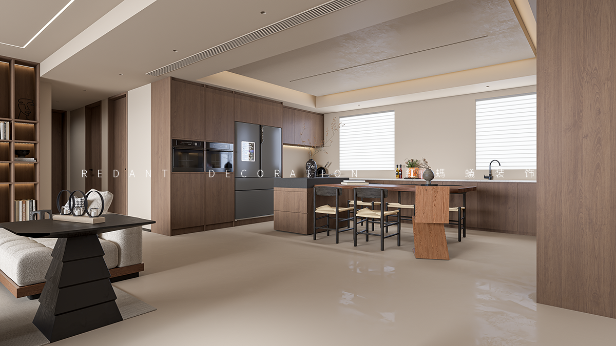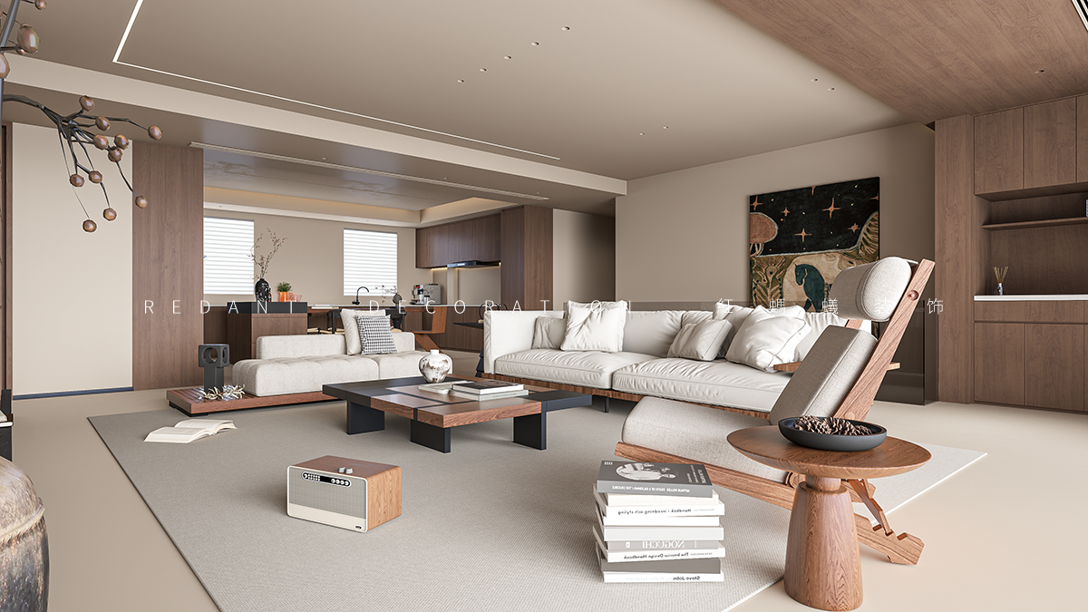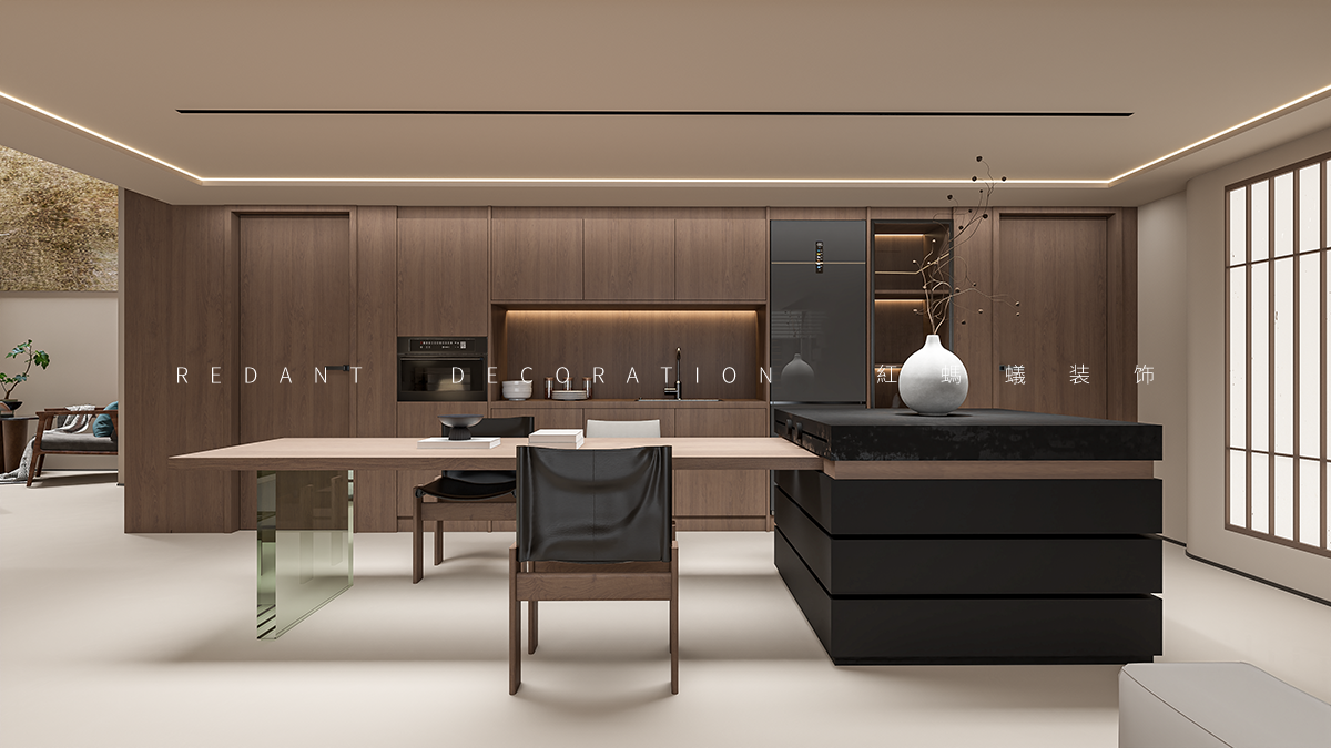 本方案以现代简约风格出发,整个空间以浅色系的空间感,搭配上舒适自然的家居布置,棕色的细节点缀让空间更加高级大气,营造出一种轻松自然的氛围。使用开放式厨房,餐厅将岛台设计跟餐桌连在一起,增加餐厅空间感。无主灯设计,通过点、线、面等方式结合,更加美观,功能上也更多样化,光照更有层次感。稳重内敛的气质与优雅精尚的格调并置融合,着力展现雅致空间的艺术感染力。