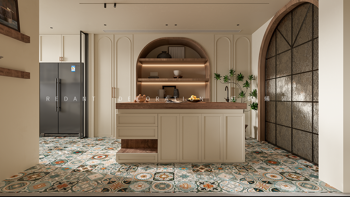 色彩与材质:以米白、原木色为主调,搭配复古花砖、藤编、做旧木材,传递自然温度与岁月质感,营造柔和、亲切氛围。