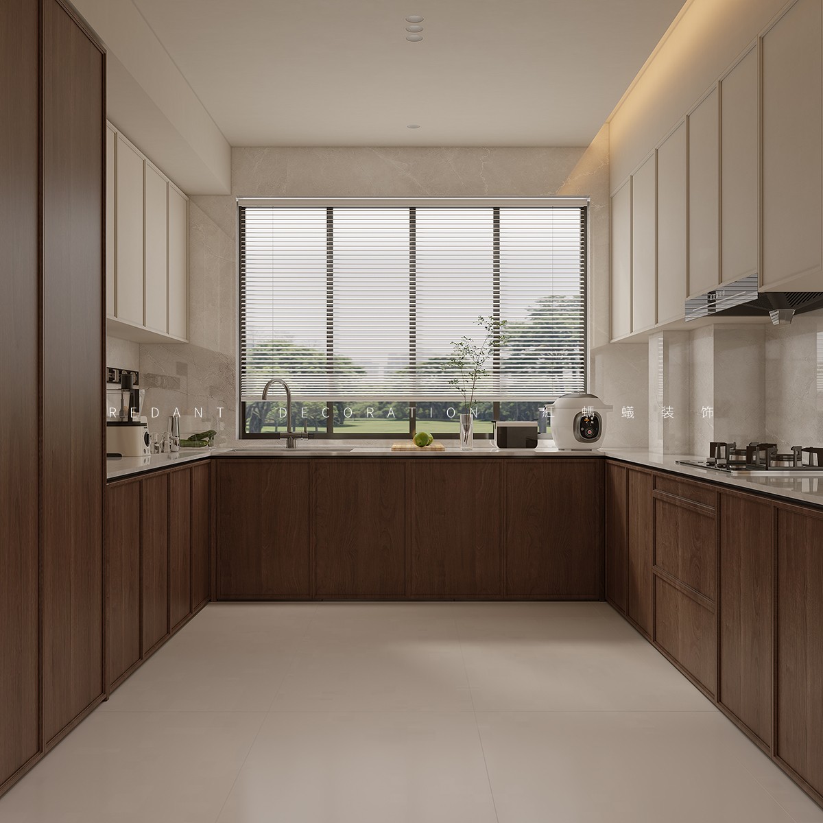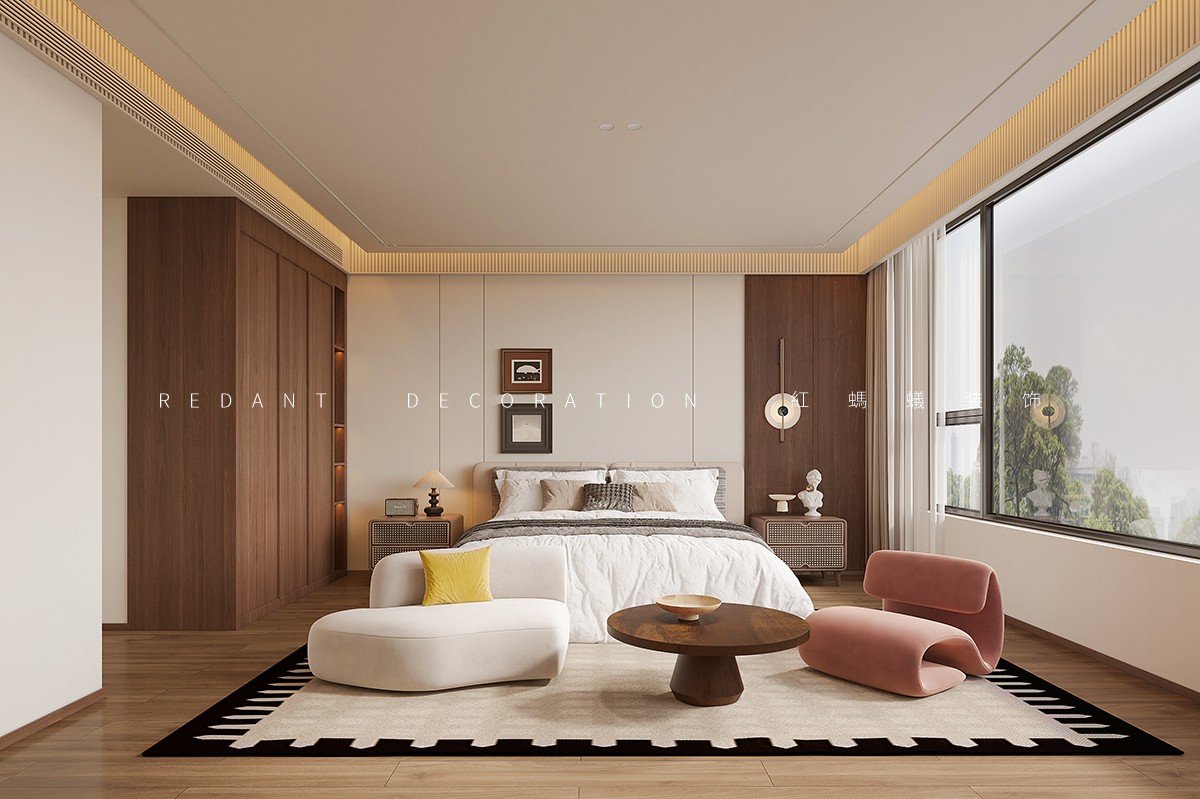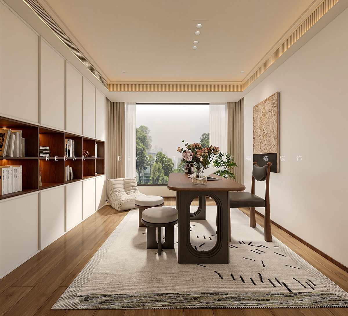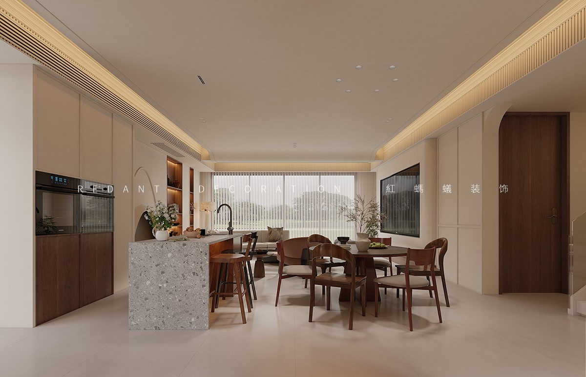 本设计以中古风为核心,结合叠墅尺度与当代实用性,打造复古又松弛的家庭核心社交区。以米白、浅咖搭胡桃木奠定雅致基调,用法式线条与木质饰面平衡厚重感。家具选弧形布艺沙发、胡桃木桌椅等,壁炉背景墙、嵌入式柜体兼具美观与收纳。落地窗引自然光融室外绿意,实现“复古而不陈旧,精致且具温度”的居住体验。